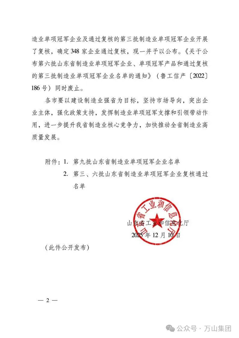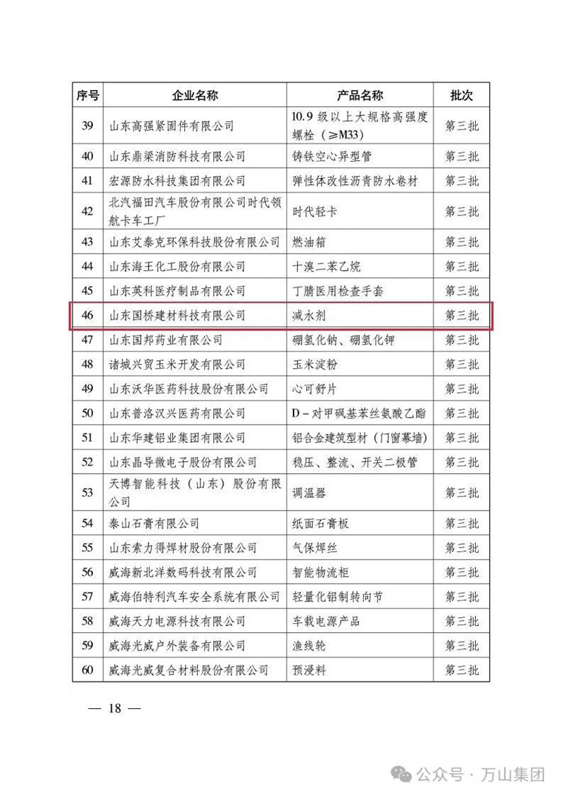 近日,山东省工业和信息化厅正式公布2025年度制造业单项冠军企业认定及复核评价结果。万山集团旗下山东国桥建材科技有限公司,凭借在混凝土外加剂领域的技术优势与综合实力,顺利通过第三批省级制造业单项冠军复核。